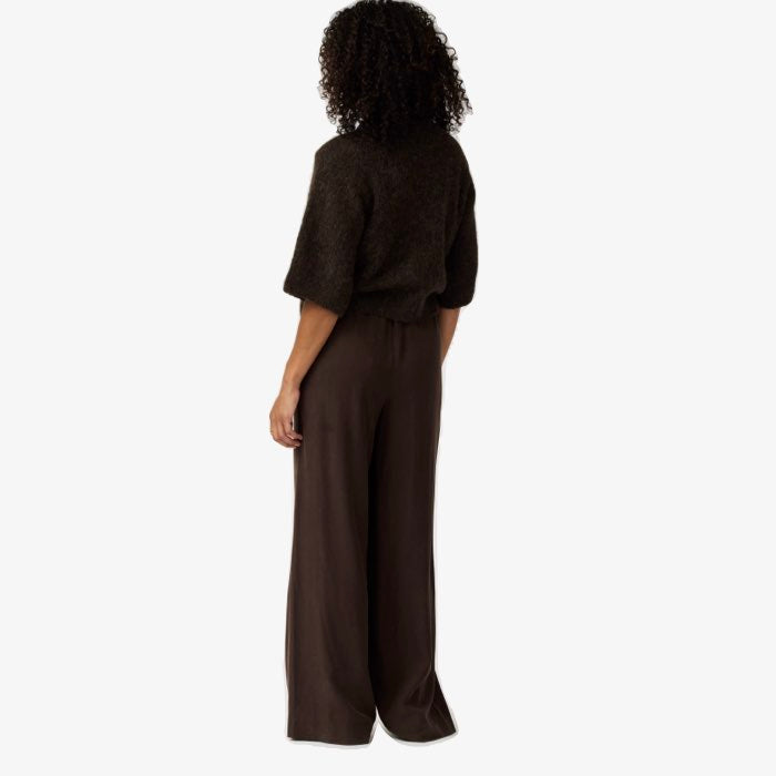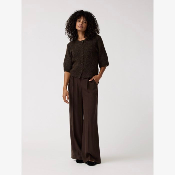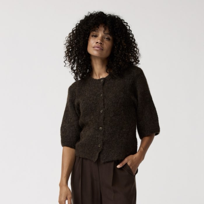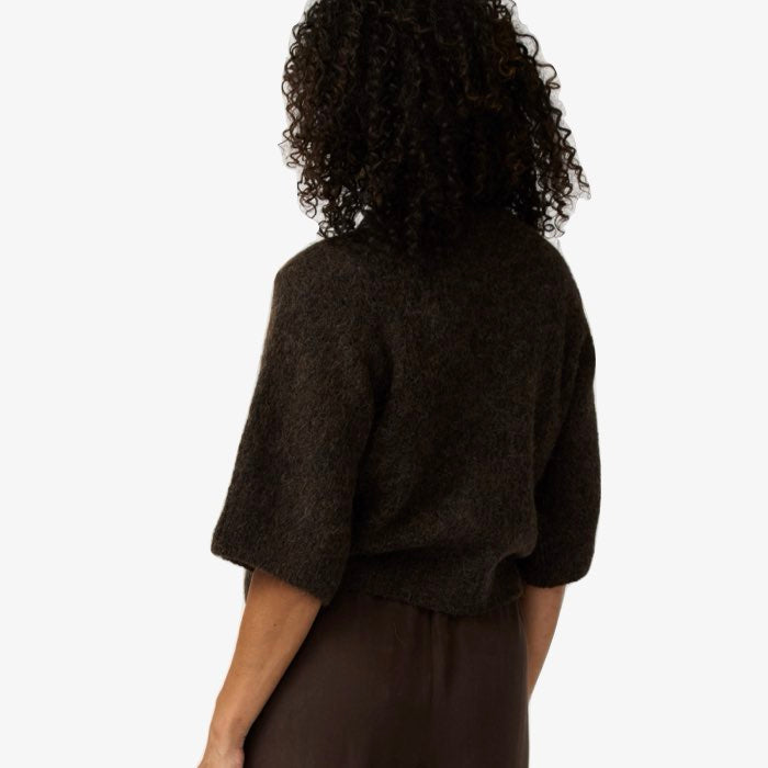 Donkerbruin, verfijnd en veelzijdig vestje voor alle seizoenen. Dankzij de zachte alpacawolmix voelt het luxueus en comfortabel aan, terwijl het kortere model met halflange mouwen zorgt voor een eigentijdse, vrouwelijke look.