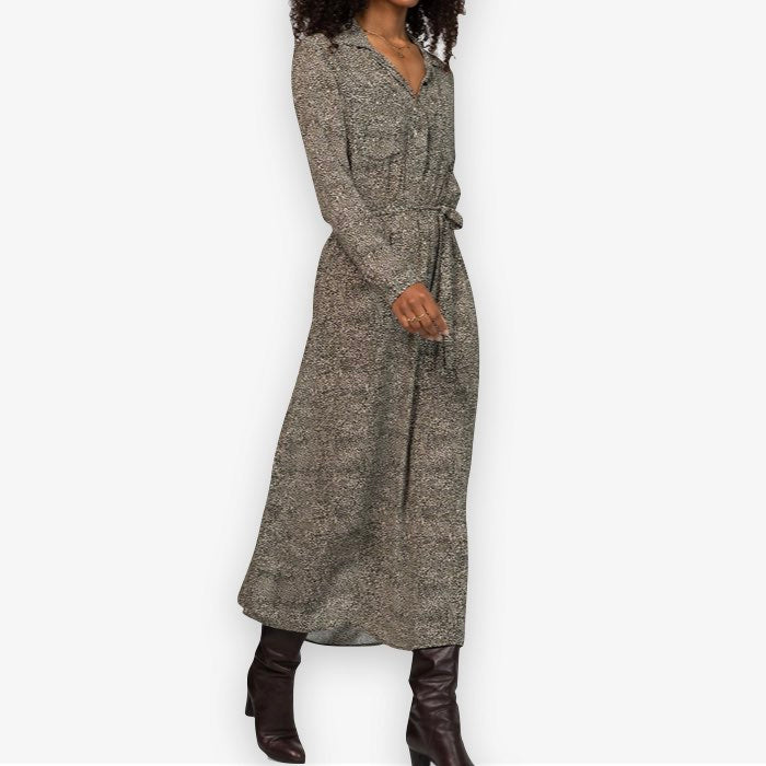 Deze lange jurk van Alchemist met groen/beige print is gemaakt van soepele 100% FSC viscose. De jurk heeft een kraagje, knoopjes aan de bovenkant, 2 zakken en een strikceintuur. Draag de jurk netjes met een hakje of lekker casual met stoere boots of sneakers.