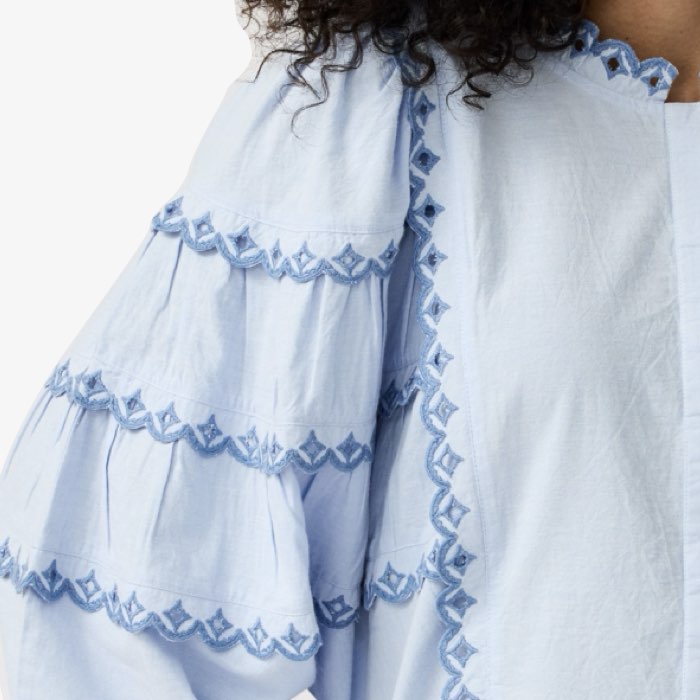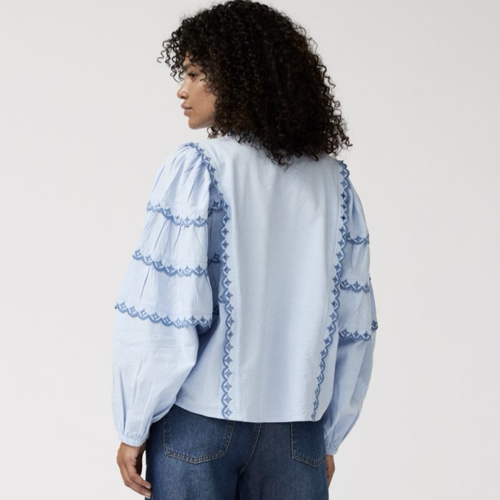 Lichtblauwe katoenen blouse met wijde mouwen en prachtige borduursels. Echt weer een snoepje van Alchemist. Zo mooi gemaakt en de wat wijdere mouwen maken de blouse vrouwelijk en elegant. Het liefst dragen wij deze blouse op een jeans.