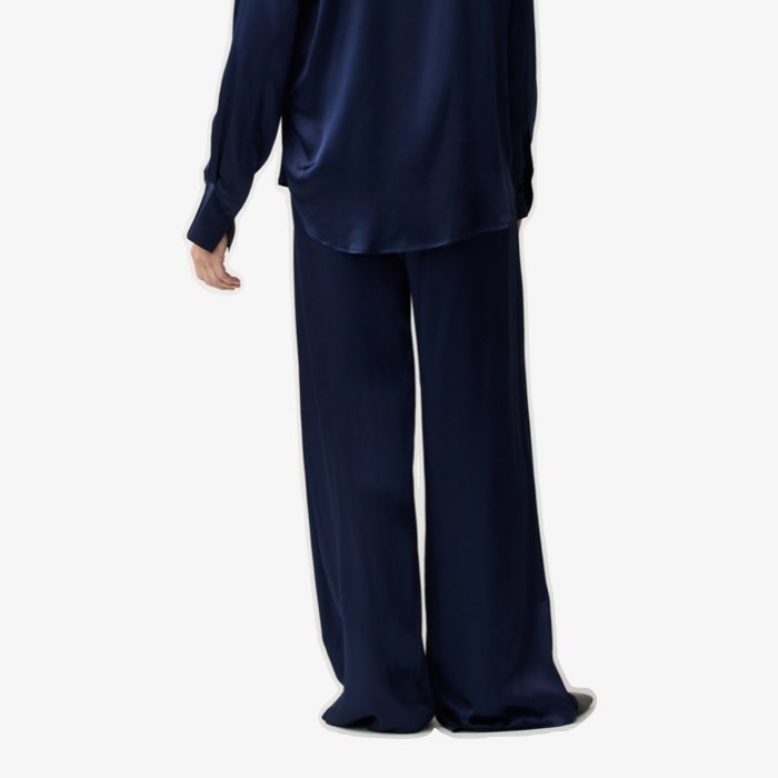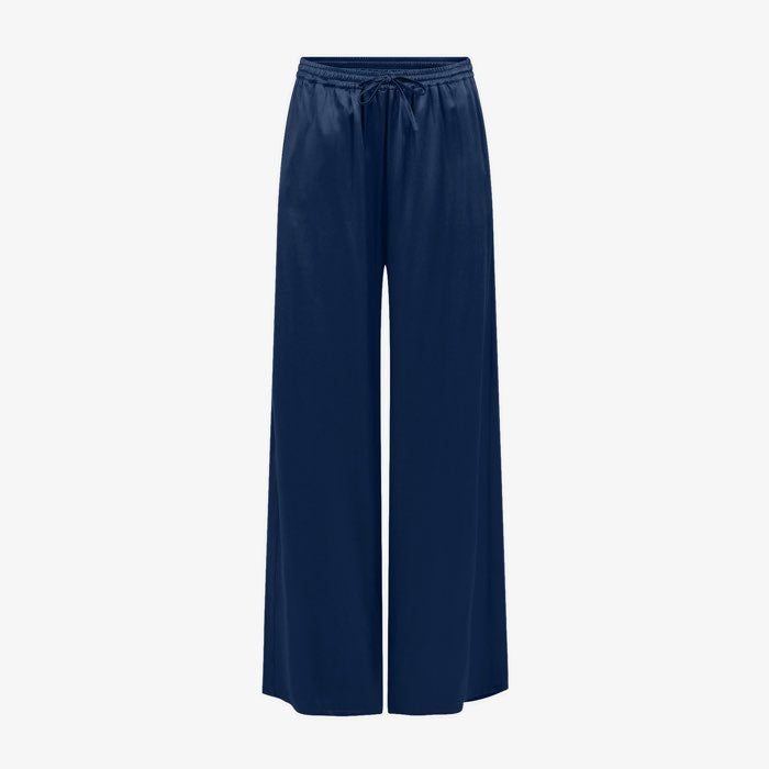 Donkerblauwe flowy satijnen broek. De favoriet van Alchemist in weer een nieuw jasje! De broek heeft wijde rechte pijpen, een elastische boord met een koordje en natuurlijk zakken! Chic en comfortabel tegelijk. Combineer de broek met de bijpassende top Oregano voor een feestelijke maar nooit over de top look, met een blazer voor zakelijk of met een lekker sweater voor een heerlijke comfy outfit.