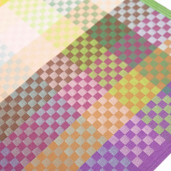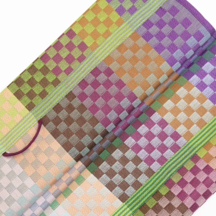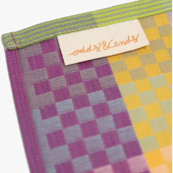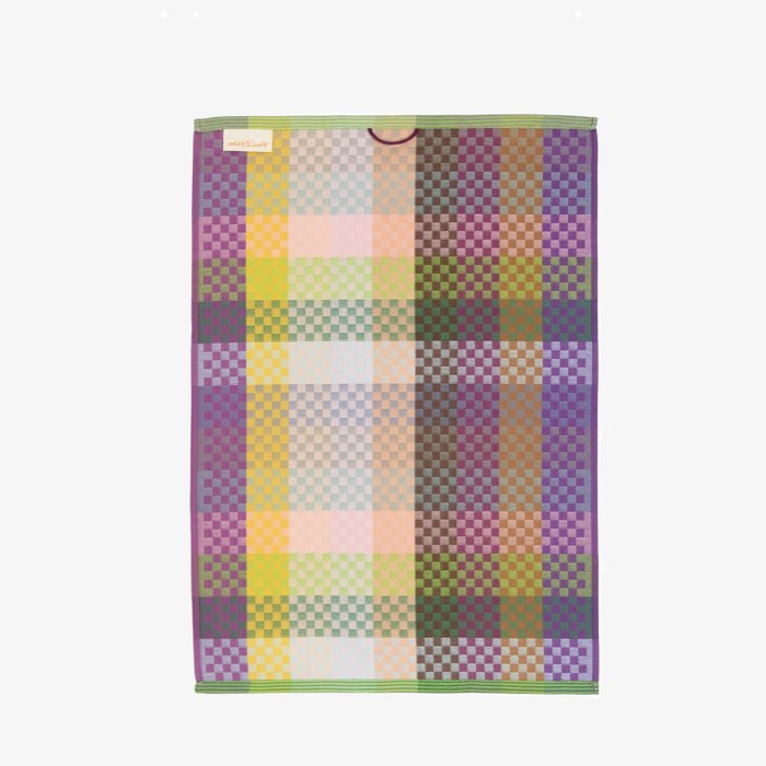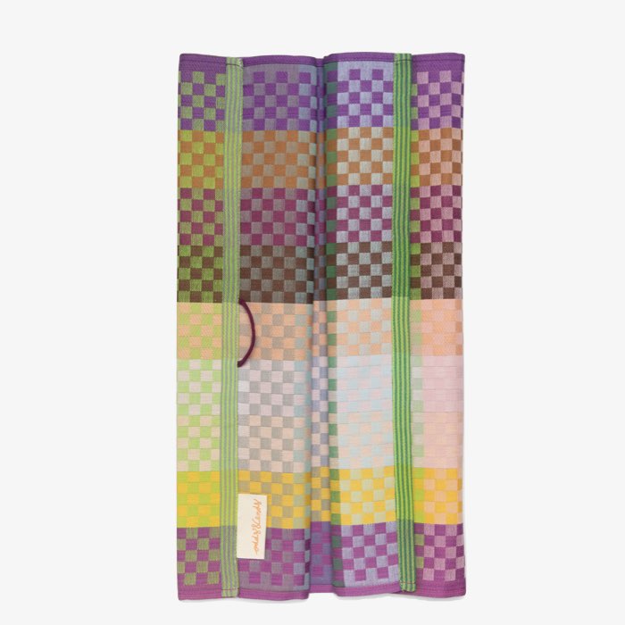 Kleurrijke theedoek in paars, groen, geel, roze uit de serie Odds & Ends van Foekje Fleur. De theedoeken zijn gemaakt van restgarens van textielfabrikanten.