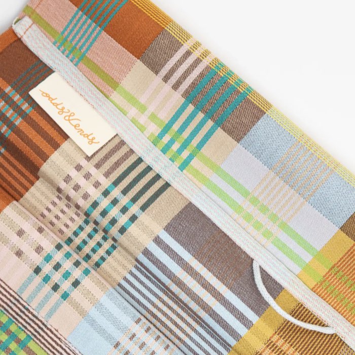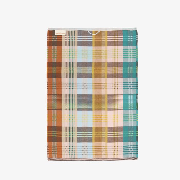Kleurrijke theedoek in bruin, groen, roze, geel uit de serie Odds & Ends van Foekje Fleur. De theedoeken zijn gemaakt van restgarens van textielfabrikanten.