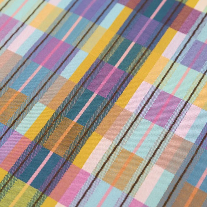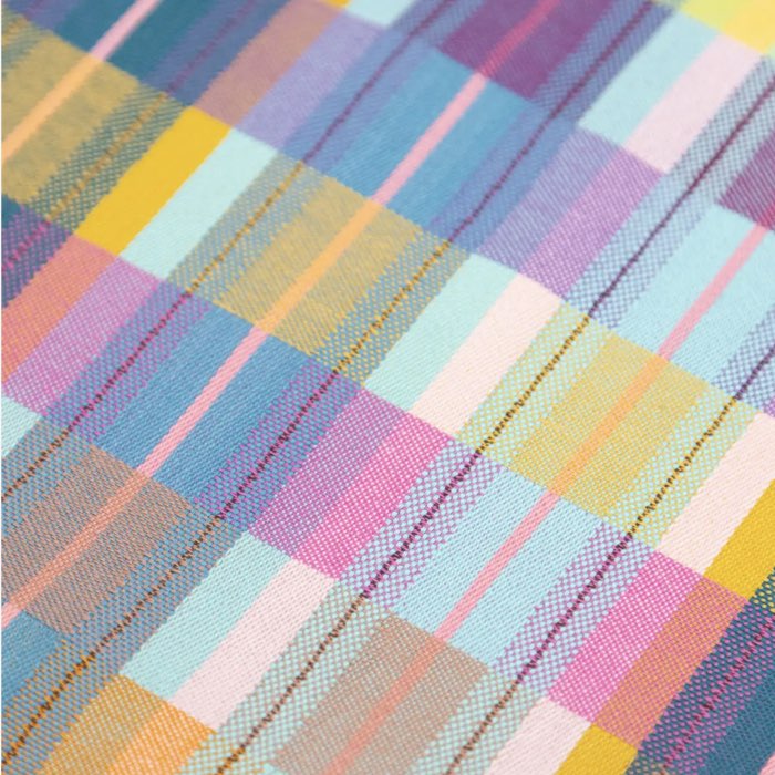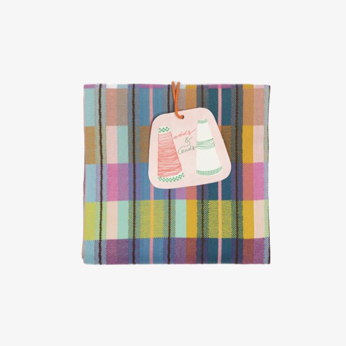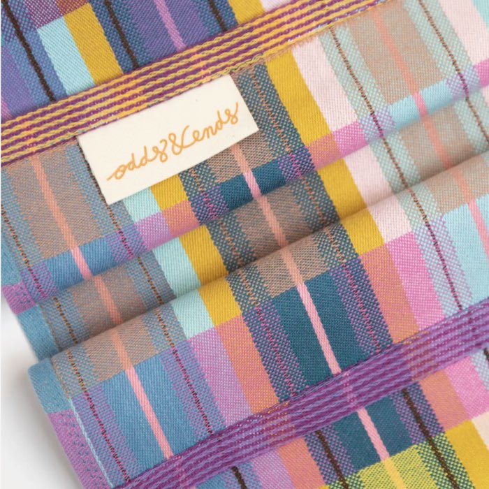 Kleurrijke theedoek in blauw, roze, geel uit de serie Odds & Ends van Foekje Fleur. De theedoeken zijn gemaakt van restgarens van textielfabrikanten.