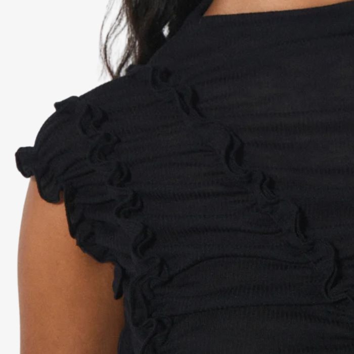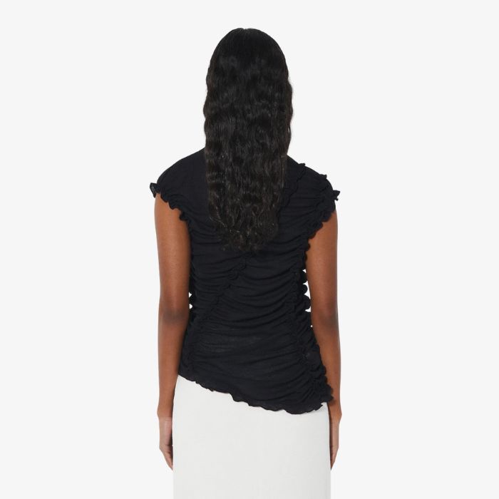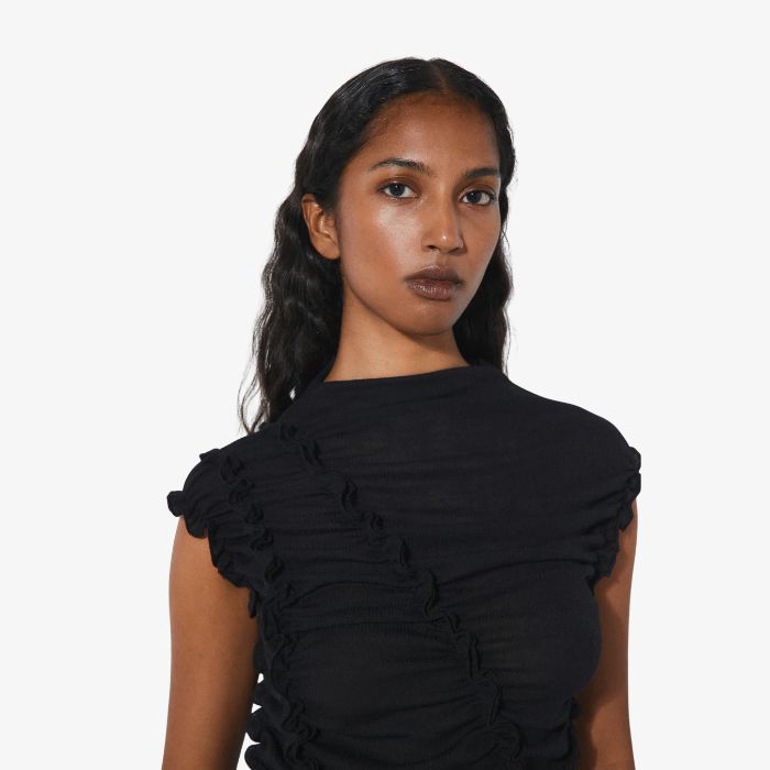 Klaar voor een avondje uit met deze prachtige zwarte top van Rita Row!. Zacht gerimpelde a-symetrische top van wol. De zwarte top heeft een klein kapmouwtje en een hoge halslijn. Combineer met een broek of rok die op de heupen mooi aangesloten zit dan komt de top het best tot z'n recht!