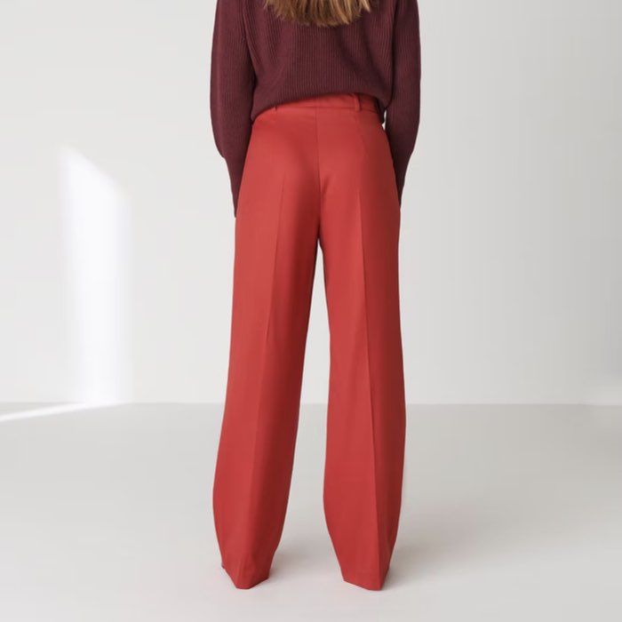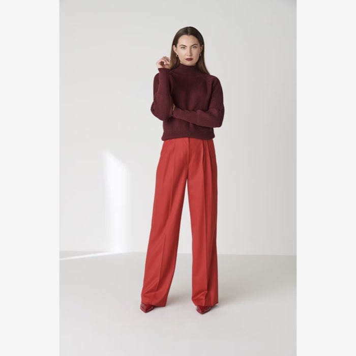 Super flatterende rode wollen pantalon. De broek heeft een hoge taille en dubbele bandplooi. Combineer met de bijpassende blazer voor een echte power suit!