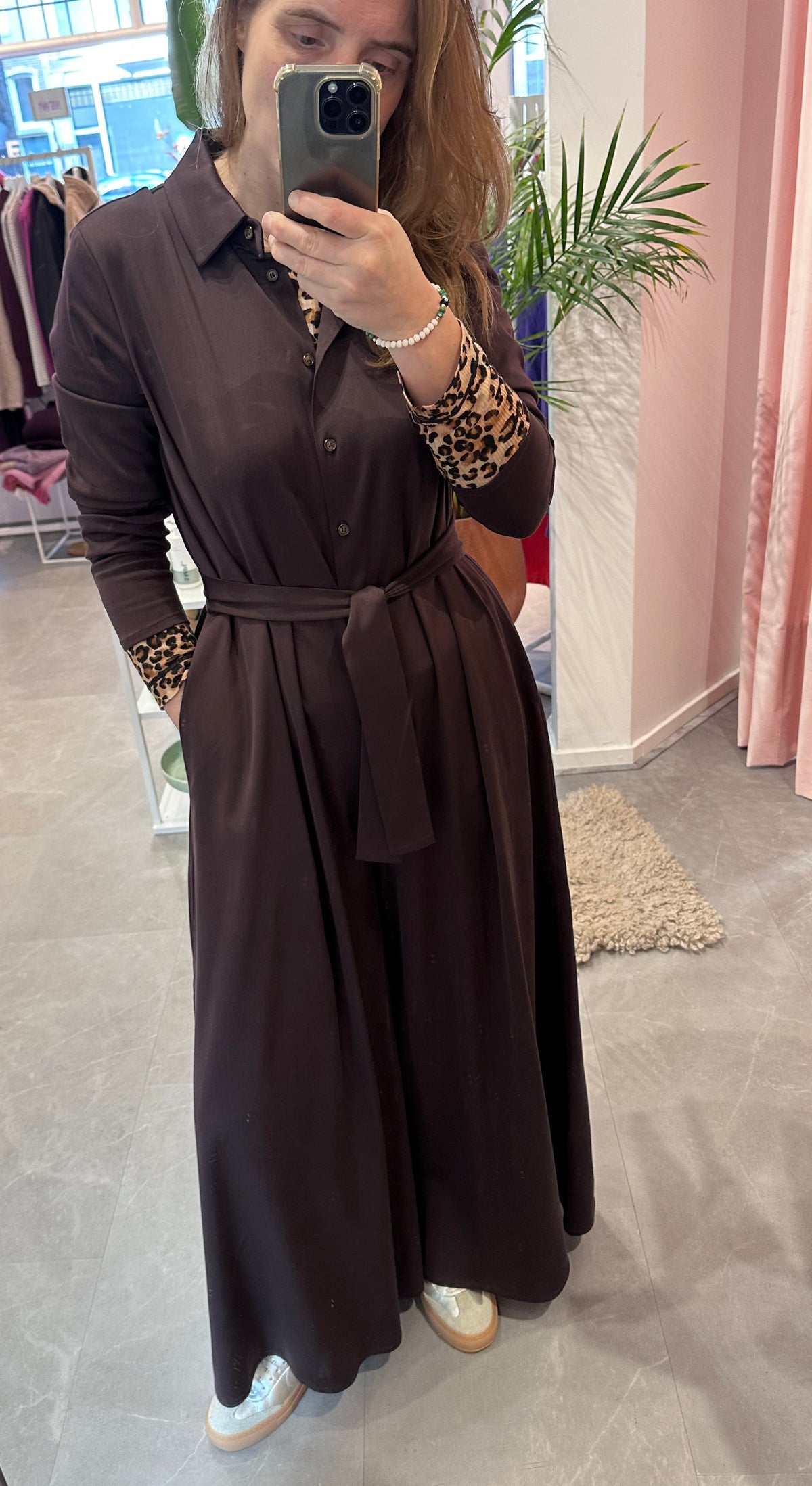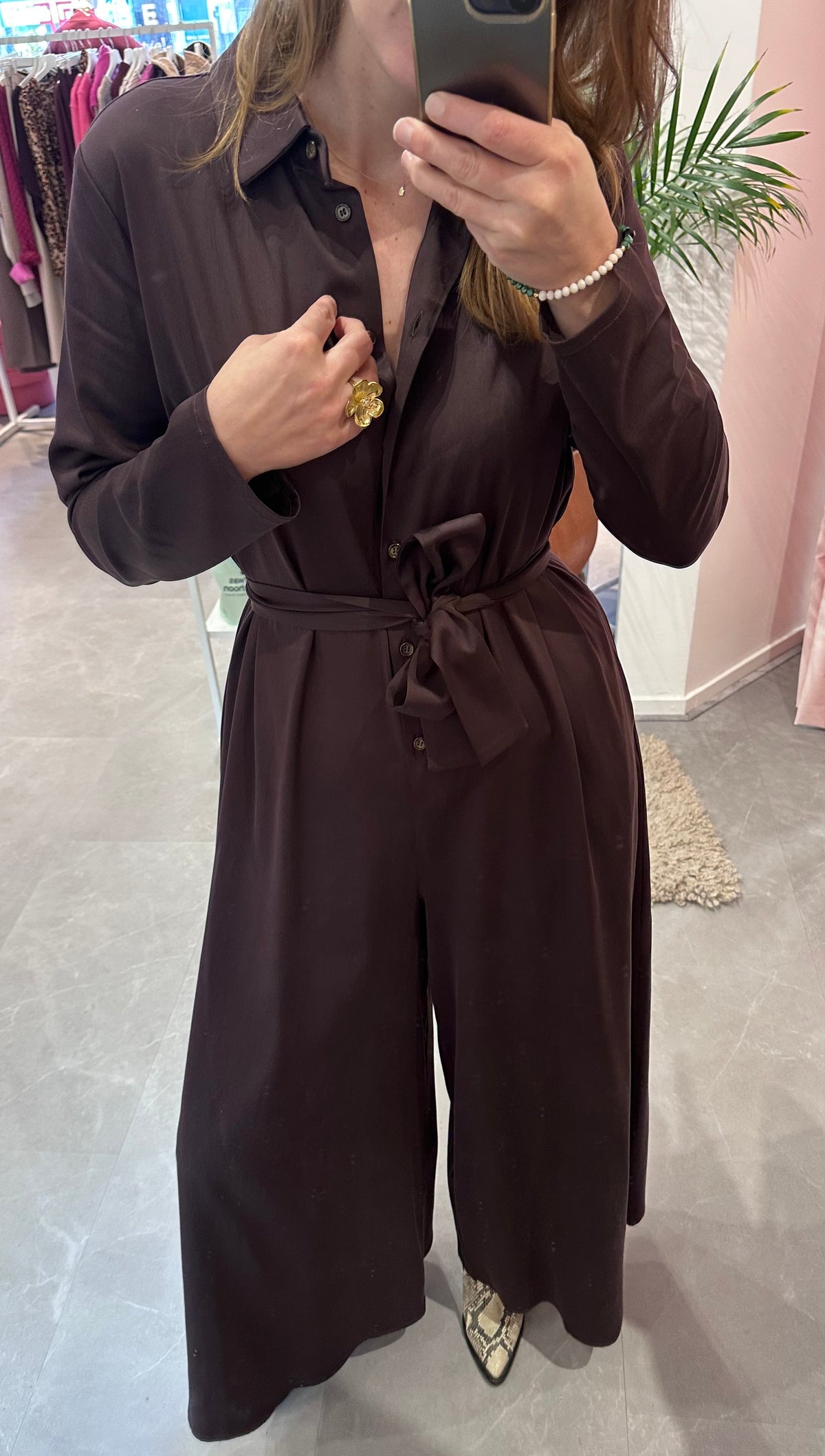 Prachtige jumpsuit in chocolade mouse bruin. De jumpsuit heeft wijde pijpen en is gemaakt van een duurzame soepel vallende stof. De jumpsuit heeft een kraagje, knoopsluiting, lange mouwen en een losse ceintuur.