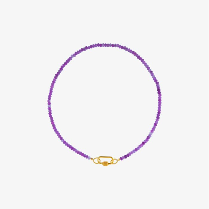 Korte ketting met kraaltjes van paarse jade en een golplated slot. Deze kettingen van I Am Jai zijn mooi om zo te dragen of combineer met een van de bedels voor een kleurrijke toevoeging aan je outfit.