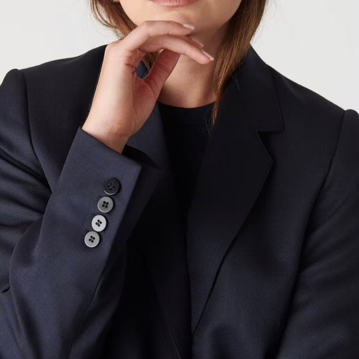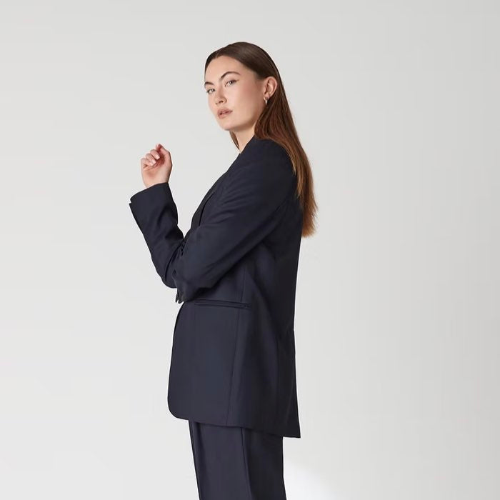 Prachtige donkerblauwe wollen blazer. De blazer is getailleerd, heeft een iets langere lengte, een een-knoopsluiting en schoudervullingen.