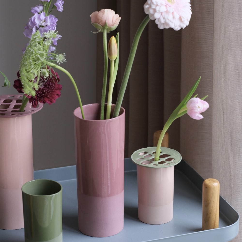 Altijd je bloemen rechtop in dit mosgroene vaasje met bloemverdeler in de kleur haver. Handgemaakt in Nederland.