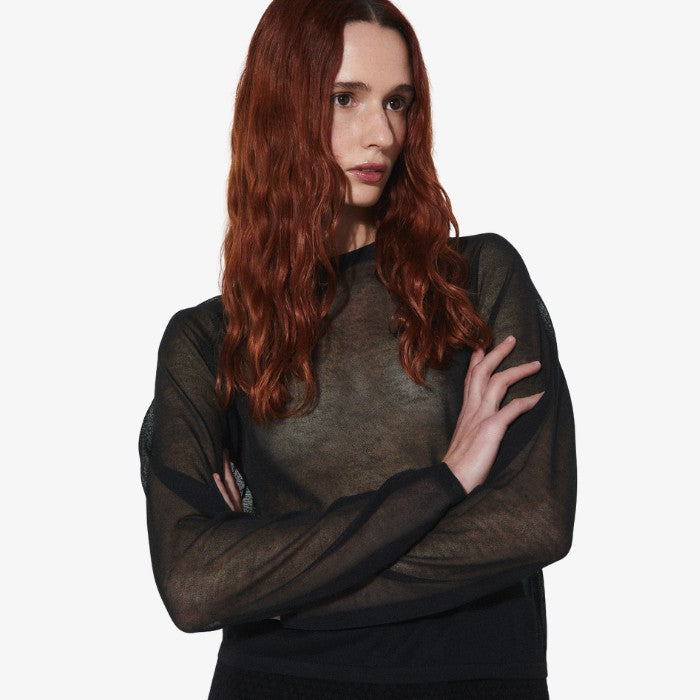 Relaxt vallende transparante zwarte top. De trui heeft raglanmouwen en een ronde hals. Wij dragen de top over een mooie bralette of een mouwloze top.