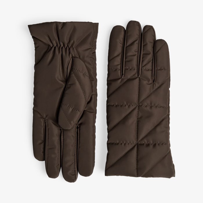 Bruine doorgestikte handschoenen van gerecycled polyester. Deze handschoenen zijn heerlijk warm en zacht gevoerd met een wolmix.
