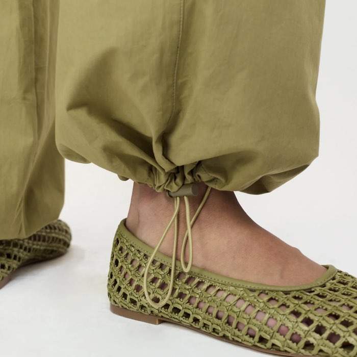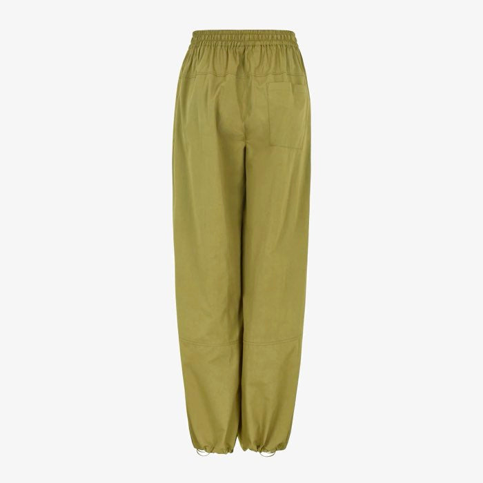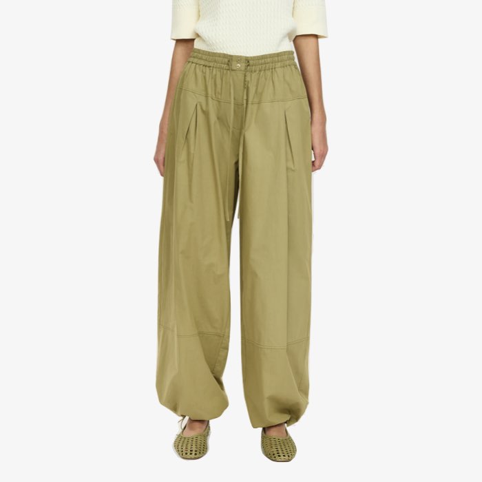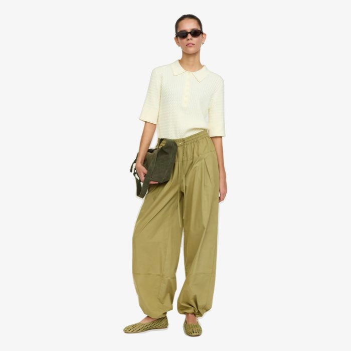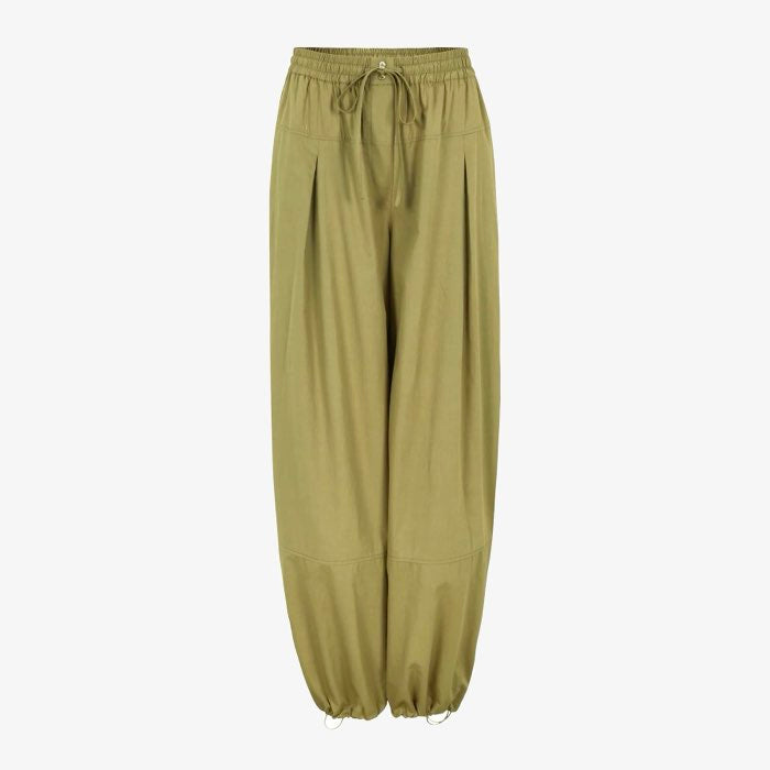Stoere broek met ballonpijpen. Draag de broek met de touwtjes aangetrokken voor een speels effect of draag de pijpen wijd. De broek heeft een elastische taille met een koordje, steekzakken en een plooitje.
