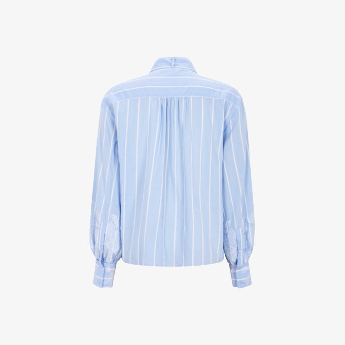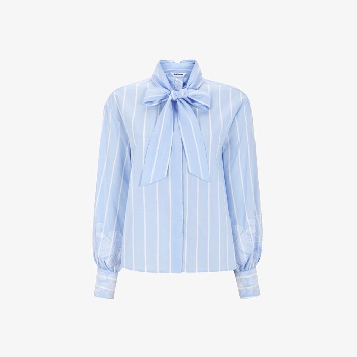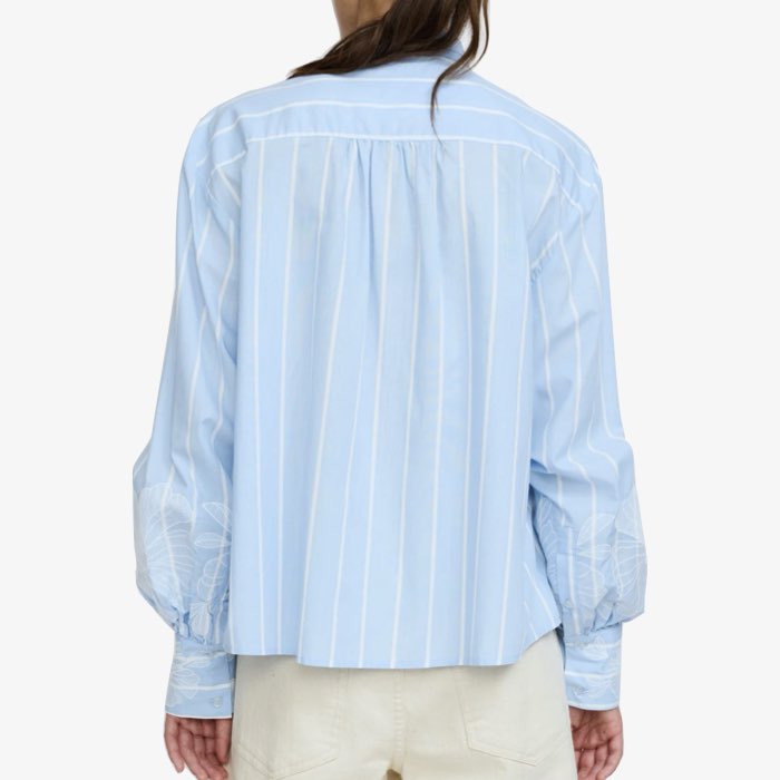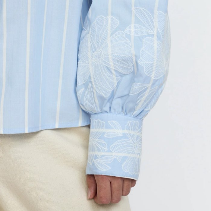 Blauw wit gestreepte blouse me afneembare strik. De blouse heeft zonder de strik een iets opstaande boord. De mouwen hebben een prachtig geborduurd bloemenpatroon.