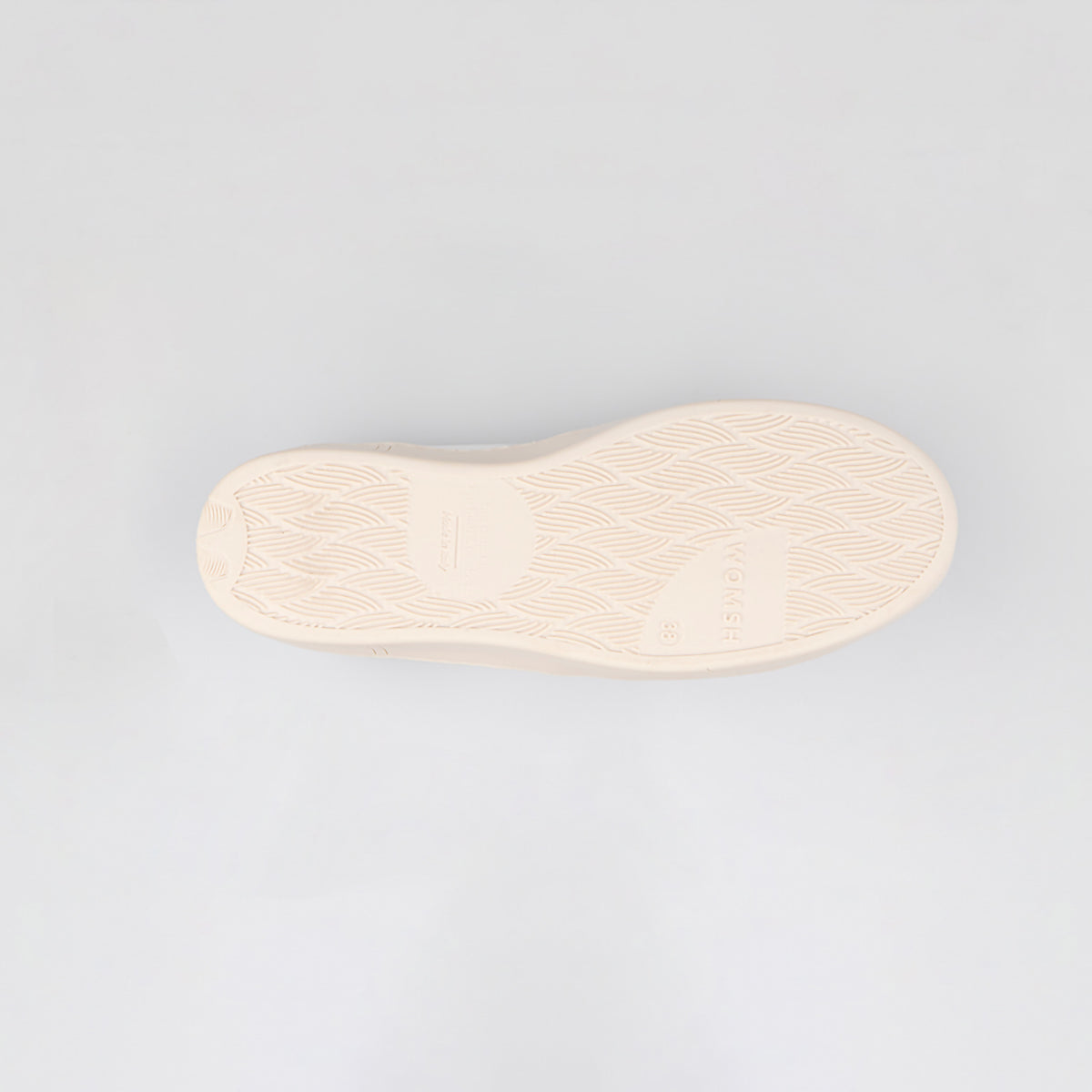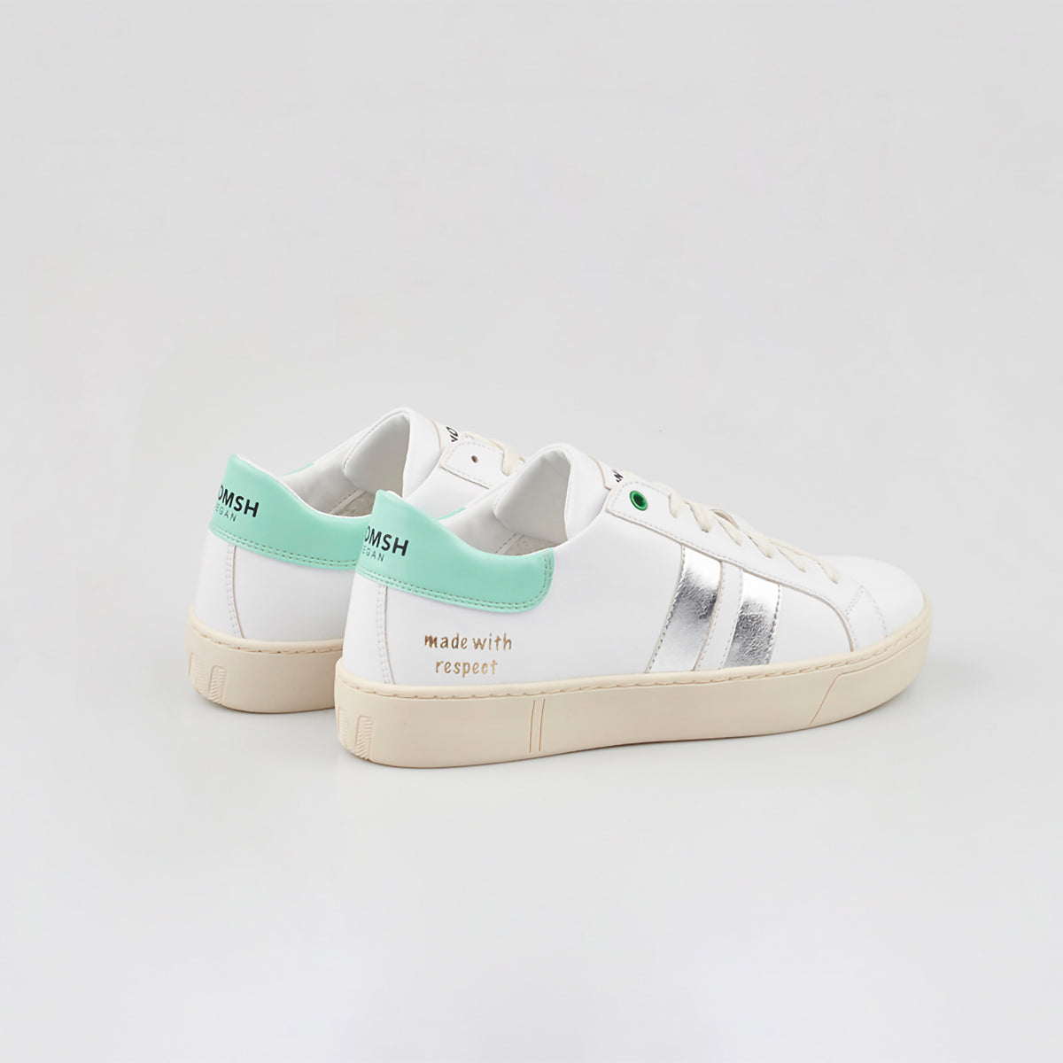 Klassieke witte vegan sneaker met groene en zilveren accenten. Womsh zijn echte Italiaanse schoenen en dat zie je en voel je meteen! De binnenzool kan eruit worden gehaald.