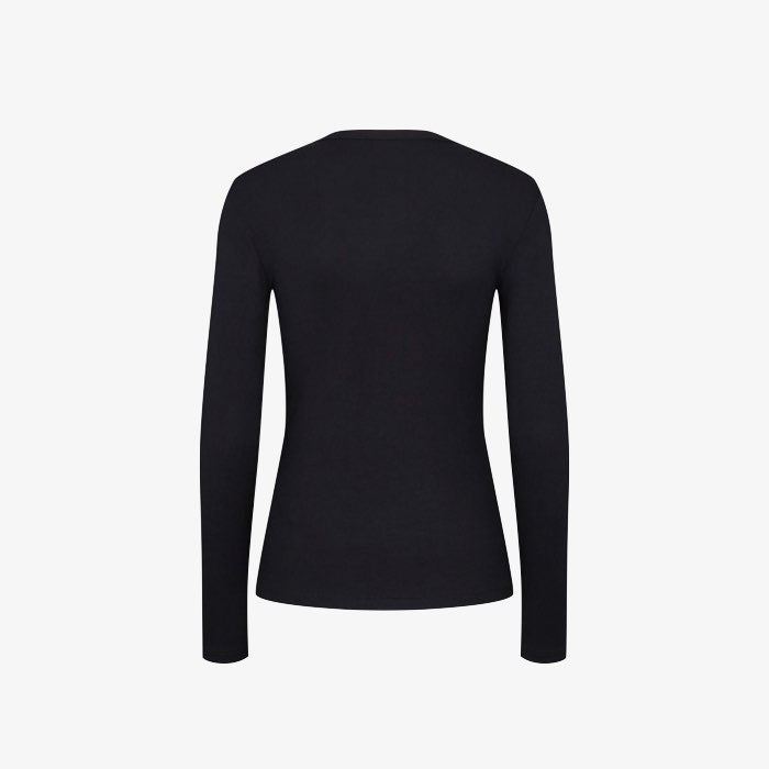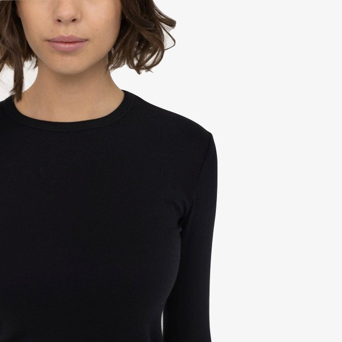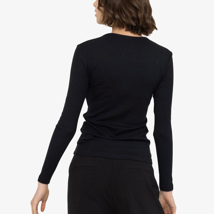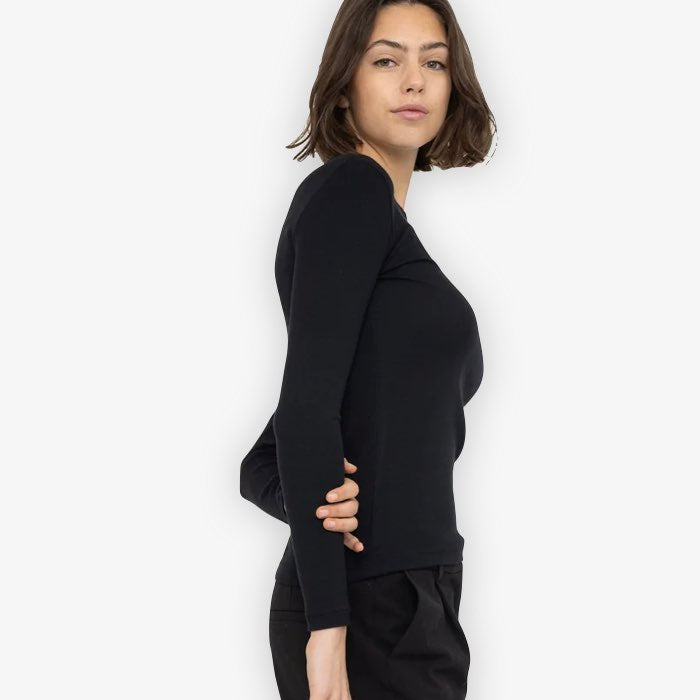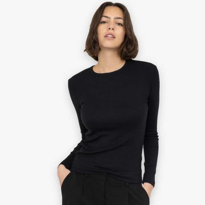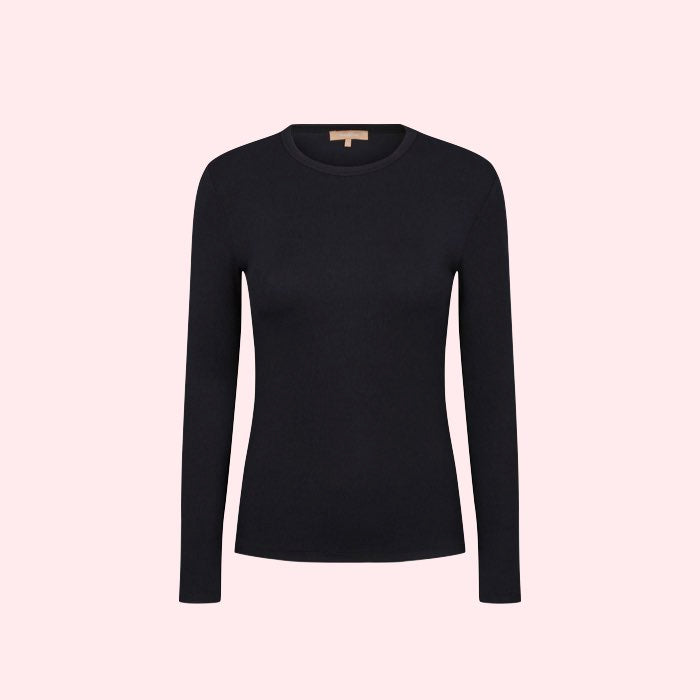 Zwarte rib top met lange mouwen en ronde hals van een superzachte kwaliteit. Deze duurzame top is de perfecte basis om zo te dragen of onder al je vestjes en jasjes. Dit basis truitje is ook verkrijgbaar in het wit en ook met een kolletje.